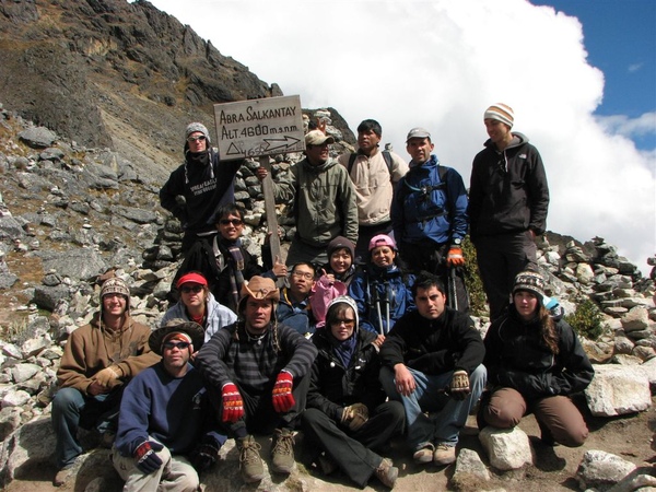 翻過一段陡峭的山路,眼前又是一大片的峽谷草原,一個似乎是冰雪融化積成的小湖座落於此,我們就在這邊稍作休息。導遊在這邊提醒我們撿一塊石頭隨身帶著,到時候到最高點的時候會搭一個塔作為紀念(不完全是為了到此一遊而作的紀念)。大概困難的路都已經走得差不多了,從這個湖過後的路程走起來並不讓人氣喘吁吁,在我們的引頸期盼下,終於Abra Salkantay的牌子出現我們眼前,抵達海拔4600 m,這段健行路途的最高點。夾住這個通道口的兩座山,被大多數白雪覆蓋的是Salkantay,而只有山頂上有一些積雪的是Tacarhuay。我們幾個先到的就在這邊隨處亂逛拍照,尤其是Salkantay被白雪覆蓋的壯觀,更是讓人忍不住的把相機對準它。在這邊我們看到很多石頭堆起的塔狀物,看來是到這邊必完成的儀式。