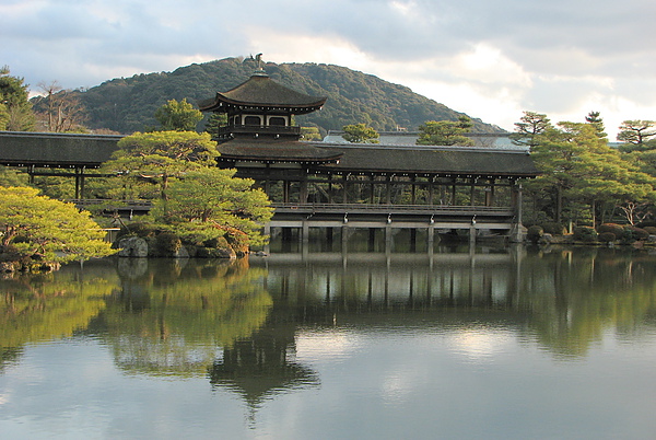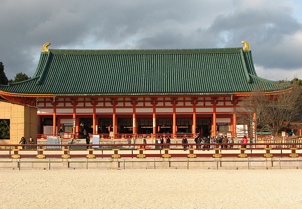 平安神宮,這座祭祀桓武天皇的神社有著皇室的氣派,庭園沒有什麼改變,唯有季節的變換帶來不同的風貌。大雨的平安神宮七年前難忘的片段,當時撐著傘走進園林裡的狼狽、躲在廊簷下拍照的窘樣歷歷在目,還有拍出來的照片有著大雨的雨絲。在厚重雲層透著藍天的背景下拍下的大極殿,灰底襯出的寶綠色屋頂與兩端的金鉤特別顯眼,而在陽光照耀下的紅色樑柱,飽和的色彩就自然而然散發出震懾人心的氣勢。遊客稀疏是這次旅行各處景點的共通特色,早也見怪不怪,反而我特別喜歡這樣的氣氛。