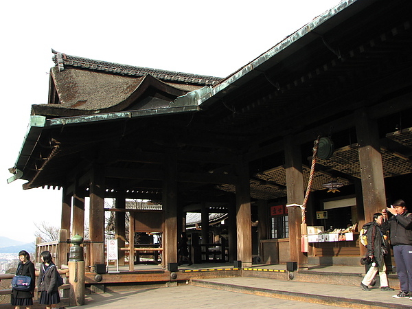 可能是冬季的關係,也可能是時間還早的關係(九點左右),從沒有體會過這樣寧靜的清水寺,總覺得這樣的熱門景點必然是人聲鼎沸的刻板印象完全被打破。穿過仁王門後路經西門、三重塔、經堂等處,不多時就來到最著名的本堂。本堂的樸素感依舊,當然我也沒忘了這座本堂的下方是由許多數層樓高的木柱所撐起的,七年前的印象鮮明,而這次來再度親眼一見依舊瞠目結舌。通過本堂後往釋迦堂方向走的左側有道岔路恫往地主神社,這座神社雖然小巧但由於掌管姻緣因此香火鼎盛,從主殿旁邊的一塊看板寫著滿滿的奉獻與感謝名錄,就知道看來是相當靈驗,而且負責的業務範圍廣佈日本國內外。地主神社的兩顆戀愛占卜石據說是情侶要是能從其中一端閉著眼睛走向另一端,則這段感情必能長長久久,不過平常時候人潮洶湧,要這樣走有相當的難度,而當天早上雖然遊客不多,但也沒有看見青年男女在那蒙眼行走。黃乙玲的”無字的情書”歌詞中寫著:“伊講情人欲愛無勇氣,才來用字騙情意”。假如有情人對自己的感情具有信心,那又何必藉由這兩塊占卜石來確認兩人的情意堅貞。不過沒有人敢對未來的事情下定論,也難怪這麼多人希望藉由算命預知未來,買護身符保求心安了。