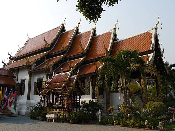 古都總會被人拿來作些比較,提到京都讓人想到的有金、銀閣寺,金閣寺的屋頂金光閃閃,而銀閣寺的木造建築透露出質樸的風格。在清邁也有金銀兩寺,各為清邁北郊山上的素帖寺與清邁週六夜市接近底端的Sri Suphan。素帖寺的舍利塔全由金箔覆蓋著,地面的磁磚是橙黃色的。清邁二月底的天氣經常是晴空萬里,白天最高氣溫直逼體表溫度,燦爛的陽光照射下磁磚發燙兼以反射高能量的日光,原本就已經使用很多黃金作為裝飾的寺廟,更加金光閃閃,多重夾攻下眼睛幾乎完全睜不開。舍利塔周邊圍起一個環狀步道,善男信女們拿著一枝花從唯一的一個出入口繞行舍利塔,參拜有其規範步驟,就在出入口處放了一張護貝的紙卡,不熟悉者可以就拿在手上照表操課。就像柴迪隆寺一樣,素帖寺雖然不在清邁市區中卻依舊香火鼎盛,從那三百多個台階的底層就可以感受到滿滿的人潮。相較下Sri Suphan除了一間還在建造的銀色佛殿外,其他的規劃環境等都不像素帖寺般別具特色。或許等到這座寺廟的工程告一段落後才能顯現出它的引人之處。