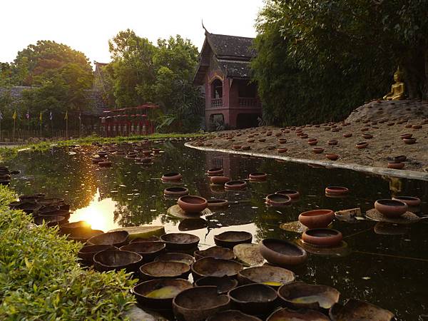 清邁的寺院很多,大約四公里見方的內城範圍中大大小小的寺廟應該超過二十座,相關的名寺包涵:帕邢寺、盼道寺、清曼寺、柴迪隆寺等,而圍繞在護城河外側的寺廟也不少,再稍遠一些的素帖寺、烏錳寺、傑祐寺等,若要說清邁由寺院所組成也不為過,同理可以把這段話套用在京都上。但我認為寺院的大白天總是光明燦爛,最令人動容的片刻,則是清晨太陽剛起與黃昏時等待日落時伴隨誦經聲的平靜安詳,那時遊客正少,反而可以悠閒地享受不同於一般觀光遊覽的匆忙。第一天走過城內的幾座寺廟,對於外觀看起來頗有古風的盼道寺印象深刻,木造寺廟本體的正門上是一隻孔雀的雕像,在建築的左側則插滿黃旗,突然有一種道教寺廟作法的感覺。但再往內走些,一座長型的水塘,菩提樹下的坐佛金像,又開啟了另種不同視野。星期一(2/25)萬佛節各寺廟晚間都有活動,隔天一早在住處附近的寺廟閑晃又走入盼道寺,水塘中浮著無數原本燒著蠟燭的小缽,晨曦照在水面上,那光線似乎可以讓人回想前一個晚間燭光點點的壯觀。