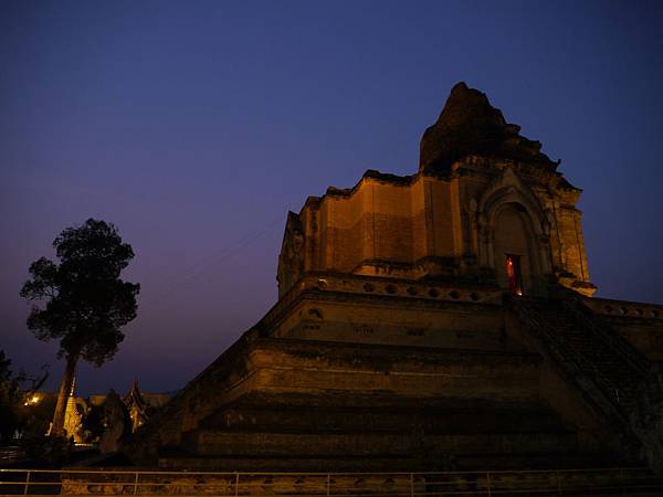 金光閃閃大概是清邁多數寺廟第一眼的共同特徵,然而在主殿的後方藏身的高塔(大多應該都是舍利塔)總是帶給人不同的驚奇。柴迪隆寺又別名大塔寺,在清邁市區(尤其在週日夜市附近)若願意稍微抬頭,其實很容易看到這座殘缺的高塔。第一次踏入柴迪隆寺是大白天,遊客、參拜人潮絡繹不絕,加上金碧輝煌的裝飾讓人沒有辦法專注,但是Keeven不斷推薦這寺廟,認為尤其在清晨與傍晚時才能享受這座寺廟最美好的時光,因此隔日一早起床後,我便散步到這邊,清晨的氣溫有些涼意,看著太陽升起,不浮誇的金色光芒照在主殿的屋瓦上與紅磚地面,帶來內心的平靜;再隔一日傍晚來到這邊,夕陽餘暉從殘圮的高塔後降落,溫黃色的燈光點亮後,那是另外一種莊嚴的平靜氛圍。這座高塔讓我想起在瓜地馬拉的Tikal的馬雅遺跡,許多座神廟林立於叢林間,一座一座的探訪、一座一座登高,無法想像千年以前這些建築是如何從平地構起。地震的關係讓柴迪隆寺這座高塔傾倒,塔上方南側最原始的那隻大象石雕(一共六隻,但只有一隻是原始的,其他都為修復過的),在歷經歲月滄桑後象鼻與象耳幾乎只剩下淺淺的痕跡,若不特別說明,大概就是這樣眼睛瞄過而已,不會留下特別的印象。大概來到寺廟的時間都不大對,所以我沒有在這邊聽到早晚的誦經聲,但光這樣的氣氛就已經讓人值得每天花個幾分鐘在這邊沉澱一下。