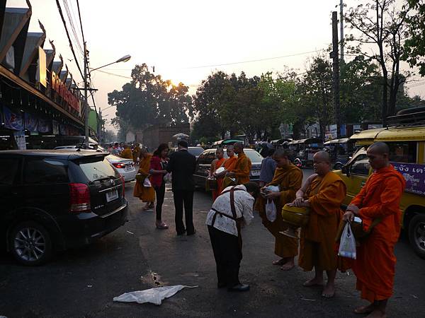 泰國的和尚很早就出門化緣。每天早上在清邁門旁的市場可以看到眾僧拿著陶缽化緣,當有信眾捐獻時,現場僧侶隨即為他們誦經祈福,或者也有一些信眾在自家門前擺上一些供奉的食物,等著僧侶經過取用。我住的民宿對面人家就天天早上在門口擺上一張小桌子放著一些東西(類似粿之類的食物),大概八點左右桌子就會收掉,也大概是這個時間後就會很少看到僧侶在路上走動。大概在這個時間交界前後,路上車水馬龍,充斥著上班上課的人潮,僧侶也大概結束今天的化緣逐漸回到寺廟中繼續當天的作息。