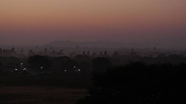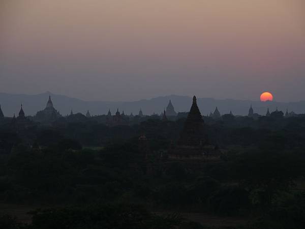 太陽光從亮金色逐漸變成金黃色,相機為了要捕捉理想的色澤,快門與光圈的值也逐步調整,從金黃色逐漸轉為飽和的橙黃色,遠山古剎皆成棕黑色的剪影,染紅染紫的天空飄著如水彩筆般輕筆帶過的幾片雲彩。不需幾分鐘的時間,陽光的顏色從新鮮雞蛋的蛋黃色轉成鹹鴨蛋的紅橙色,幾乎貼近著山稜線加速下山。看到太陽最後一抹光線隱沒在山後,遊客們也紛紛起身下寺廟,唯恐人太多而在陡峭的階梯上大塞車。幾天下來在日出日落的連番轟炸下,卻一點也不感到厭煩,後來在仰光還在大金寺痴痴地等待太陽下山後拍攝金塔的夜景。出門在外旅行總有一些莫名其妙的執著或矛盾是連自己都無法解釋的。