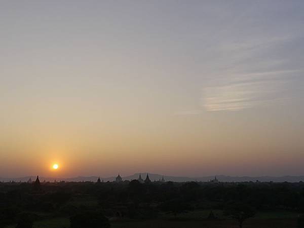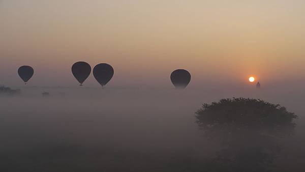 大約十來度的氣溫下,大家穿著有點厚的衣物,看著東方天空逐漸轉亮,佛塔與遠山的剪影逐步逐步現出芳蹤。但在轉亮的同時也發現地面似乎開始起霧(後來覺得那其實不是霧,而是有人燒材的炊煙之類的)。霧厚厚的一層,讓人心裡都涼了半截,總覺得今天要看到日出似乎是不大可能的事情了。不過另一件事情吸引我們的注意力:在東北方看到熱氣球。在到Bagan之前就知道這邊一樣在清晨有熱氣球可搭,從高處俯瞰古城的滄桑與風華,而此處的價格實在非常高,加上在土耳其已經有搭熱氣球的經驗,所以也不特別強求在這體驗熱氣球之旅。熱氣球充飽後,漸次地往南方飛行,在這時候一片低空的迷霧反而塑造出一種如仙境般的朦朧美感,若隱若現的佛塔更是讓人虛實難測,增添神秘的氣氛。原本不期待的日出,卻在Bagan Tower後面悄悄地冒出頭來,眾人驚歎!大概很難有地方再像Bagan的日出這樣充滿著戲劇性的張力與層次,當太陽完全冒出頭後,金色的光芒灑在逐漸散去的霧上,熱氣球也漸漸降落,天空的顏色從金黃漸漸轉為清藍,而聚集在塔端平台的中人們心滿意足,才逐漸走下台階,再次經過那窄小的通道。美景總是稍縱即逝,腦袋心滿意足,但這時正是飢腸轆轆。早餐時間到了。
