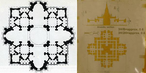 (左) Donato Bramante的聖彼得大教堂平面圖 (右) Ananda Phaya平面圖