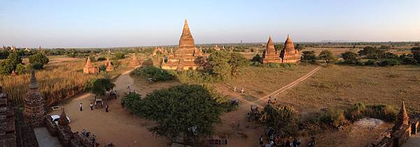 一整天的行程終於要在日落中結束。面對東方的寺廟群,磚紅色的建築染上金黃色的陽光,像是水彩畫般的多了一層水暈。寺廟的大小不一,距離遠近錯落,想像中間的雜草地可能就是早已灰飛煙滅的民居,合理推測這個王國曾經的風華絕代。這種顏色有種令人炫目的美,也令人產生一種稍縱即逝的不捨,透過眼睛烙入腦海中的記憶,還得搭配先進科技的輔助,所以站在寺廟的高處平台,拿出口袋裡的iphone開啟全景模式,如同在進行一項莊嚴儀式般,從左至右平穩地掃過這片大地,影像隨之記錄在記憶體當中,腦袋與快閃記憶體中都製作了一份拷貝,隨著時間的流逝,不曉得哪個拷貝會比較快地消失在這世界上。陸陸續續從道路的另一端馬車駛來,越來越多的觀光客聚在這邊,在望向西方的位置上坐好卡位,希望能有個好位置好好欣賞大自然的光影秀。雖然連著幾天從烏坪橋、曼德勒丘到Bagan都是日落的行程,但是我們總是貪婪的希望要看得更多,在一個淳樸(原則上是)而不受污染的地方,去感受自然與人互動過程中所產生的微妙景觀流動與變化。