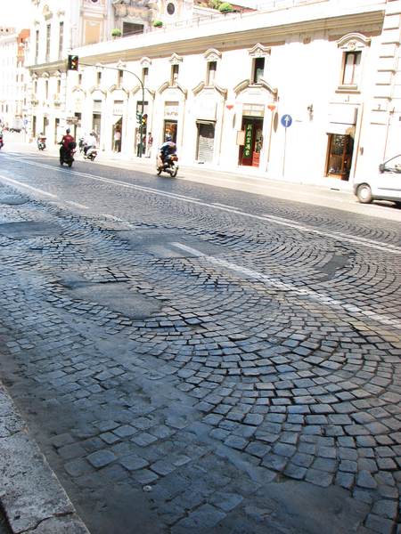 走在龐貝的石版路上其實相當惱人,人家說貴州地無三里平,在龐貝的石版路真是”地無三米平”,當時馬車跑在路面上壓出來的軌道痕跡至今仍然清晰可見,這樣的道路讓我後來抵達羅馬時都不得不回想起龐貝的石版路。羅馬的各大主要道路至今仍是用黑色的石版鋪成,而龐貝是使用大石塊鋪成馬路。這兩者的共通性就是車子在上面走久了會壓出痕跡,然後路面就變得極不平坦,車子行駛在上面晃動相當厲害,所以通常也無法開太快。這時候還是不得不佩服義大利人能夠忍受這種顛簸的路面,這種路要是在台灣應該早就被駕駛人要求換成柏油路了。即使在德國,這種石板路通常也只出現在舊城區或者行人徒步區中,幾乎整個城市的重要幹道都是石版路,除了義大利之外,還真不曉得有哪個國家也這樣搞。